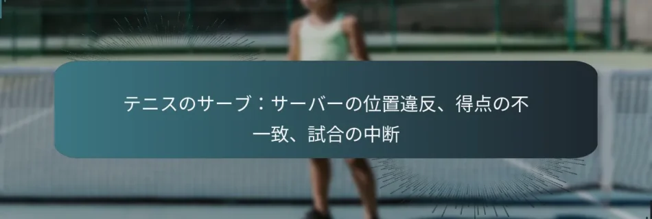 テニスのサーブはゲームの重要な側面であり、サーバーの位置に関するルールを遵守することは公平性を維持するために不可欠です。この分野での違反や得点の不一致、試合の中断は、プレイの流れに大きな影響を与え、選手や審判の間に混乱を引き起こす可能性があります。これらの問題を理解することは、選手と観客の両方がスポーツの複雑さを理解するために重要です。 テニスにおけるサーバーの位置違反とは何ですか? テニスにおけるサーバーの位置違反は、サーバーがサーブ中にコート上の配置に関する確立されたルールを遵守しない場合に発生します。これらの違反はゲームの公平性に影響を与え、ペナルティやポイントの喪失につながる可能性があります。 サーバーの位置違反の定義 サーバーの位置違反とは、選手がボールをサーブする際に立っている場所に関連する違反を指します。テニスのルールによれば、サーバーはボールを打つまでベースラインの後ろに留まり、サイドラインの想像上の延長線内にいる必要があります。この位置からの逸脱は違反と見なされる可能性があります。 これらの違反は、両選手が競争するための公平な機会を確保するために設計されています。正しい位置を遵守することは、ゲームの整合性を維持し、サーブが一貫した出発点から実行されることを保証します。 位置違反の一般的な例 サーブ中に位置違反を引き起こす一般的なシナリオはいくつかあります。これには以下が含まれます: フットファルト:サーバーがボールを打つ前にベースラインの上または外に足を踏み出すこと。 不適切な位置取り:サーバーが指定されたエリアの外、例えばセンターマークの左または右に遠すぎる位置に立つこと。 ラインの後ろからサーブしない:サーバーがボールとの接触時にベースラインの後ろに留まらないこと。 これらの違反は、試合の流れを妨げる可能性があり、一貫して無視されるとペナルティが科されることがあります。 試合中の位置違反の結果 位置違反はテニスの試合中にさまざまな結果を引き起こす可能性があります。最も直接的な影響は、フットファルトやその他の違反によるポイントの喪失です。これはゲームの勢いを変え、サーバーの自信に影響を与える可能性があります。 繰り返し違反が発生すると、審判から警告が出されることもあり、深刻な場合にはゲームペナルティにつながることもあります。このようなペナルティは、特に重要な瞬間に試合の結果に大きな影響を与える可能性があります。 位置違反を特定する方法 位置違反を特定するには、通常、審判やラインジャッジの注意深い観察が必要です。彼らはフットファルトや不適切なコートの位置取りなどの特定の違反を探します。選手は、ベースラインやサイドラインに対する足の位置を意識することで自己監視することもできます。 ビデオリプレイ技術を使用することで、これらの違反を特定するのに役立ち、サーブ中のサーバーの位置をより正確に評価できます。選手は、違反を避けるために正しい位置を維持することに焦点を当ててサーブの練習をすることが奨励されています。 位置違反を理解するための視覚的補助 視覚的補助は、サーバーの位置違反の理解を深めることができます。ベースラインやサイドラインに対する正しいサーブの位置を示す図は有益です。さらに、フットファルトや正しいサーブ技術を示すビデオクリップは、明確な例を提供します。 以下は推奨される視覚的補助です: サーブエリアがマークされたコートの図。 正しいサーブの位置と不正確なサーブの位置のビデオ例。 これらのリソースを活用することで、選手やコーチはテニスにおけるサーブ位置ルールの遵守の重要性をよりよく理解することができます。 テニスにおける得点の不一致はどのように発生しますか? テニスにおける得点の不一致は、ポイントカウントのエラー、審判による不正確なコール、または選手間の得点に関する誤解から生じます。これらの問題は、試合中に混乱や中断、潜在的な争いを引き起こす可能性があります。 得点の不一致の定義 得点の不一致とは、テニスの試合中に記録された得点の不整合やエラーを指します。これには、誤ってカウントされたポイント、不正確なゲームやセットの得点、またはコミュニケーションの崩壊による得点の追跡の失敗が含まれます。このような不一致は試合の流れや選手の集中力に影響を与える可能性があります。 これらのエラーは、ラインジャッジがボールのインまたはアウトを誤ってコールするなどの人的ミスや、電子スコアボードの技術的な問題によって発生することがあります。これらの不一致の性質を理解することは、選手と審判の両方にとって重要です。 得点の不一致を引き起こす一般的なシナリオ テニスの試合で得点の不一致を引き起こす状況はいくつかあります。一般的なシナリオには以下が含まれます: ラインジャッジや審判による不正