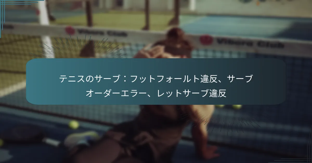 テニスのサーブには、選手が遵守しなければならないいくつかの重要なルールがあり、フットフォールト違反、サービスオーダーエラー、レットサーブ違反が含まれます。フットフォールトは、選手がサーブ中に足を不適切に配置した場合に発生し、サービスオーダーエラーは、順番を守らずにサーブした場合に生じます。また、レットサーブは、サーブがネットに触れた後でも正しいボックスに入る場合に発生し、ゲームプレイの中断を引き起こす可能性があります。これらの違反を理解することは、試合の整合性を維持し、公平なプレイを確保するために不可欠です。
